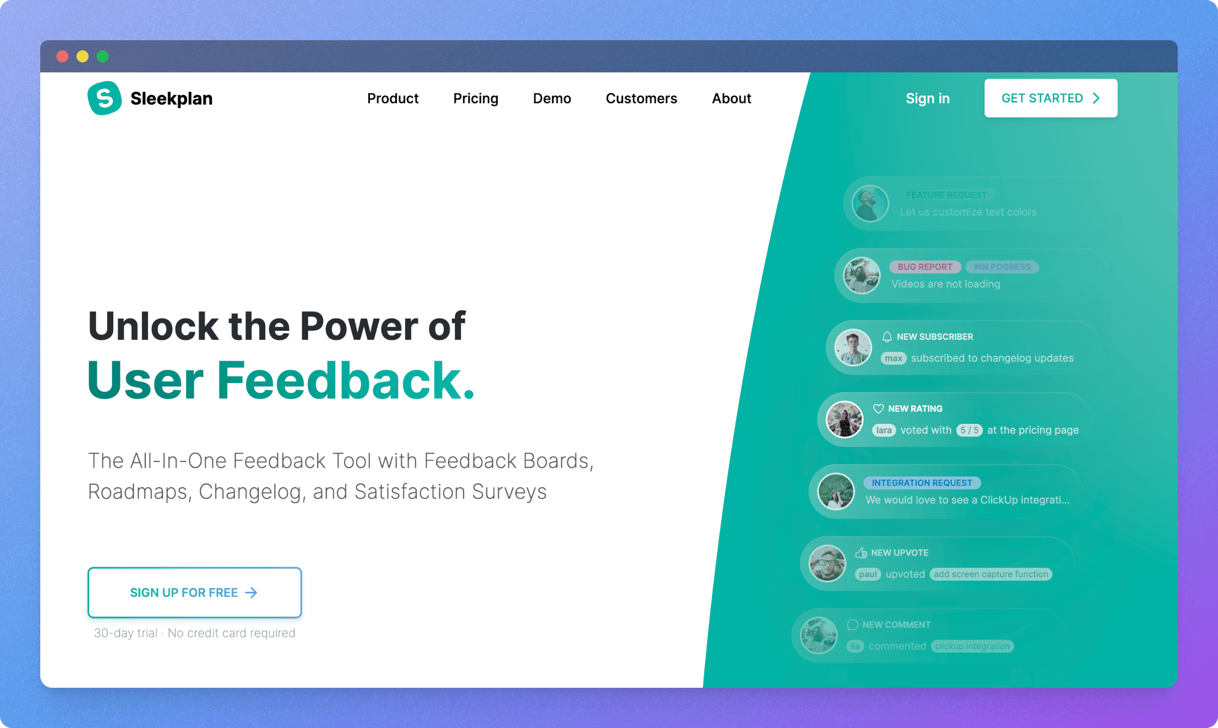 Sleekplan offers both feature request management and customer management. It tracks customer satisfaction, and like other Frill alternatives, this platform has a focus on closing the feedback loop through sentiment analysis and structured visibility.